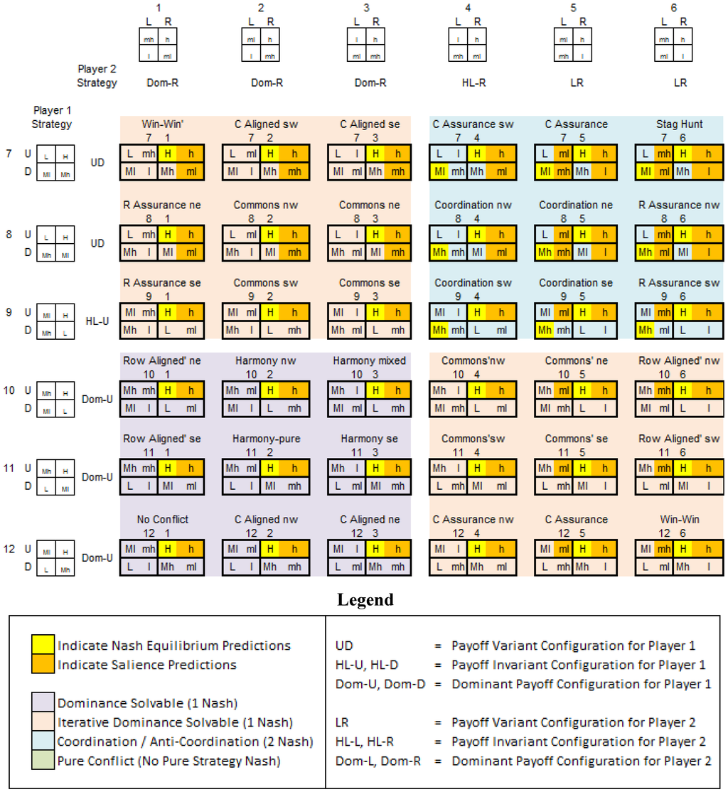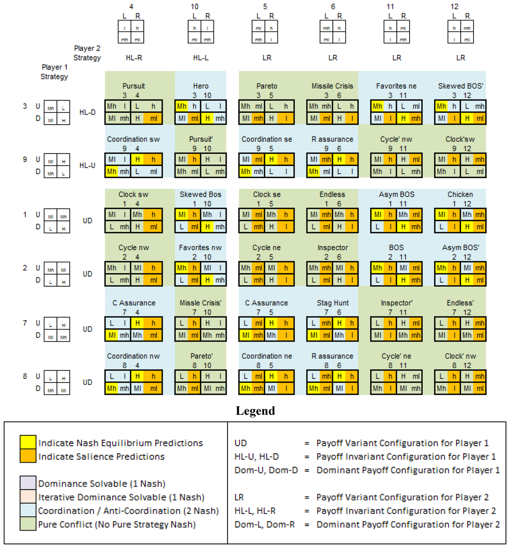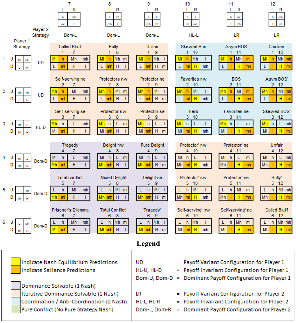- 8Predicted outcomes are the same for Player 2 except for cyclic games with HI/IL structures for both players. In these games, Player 2s best responses would result in the upper left and lower right (rather than lower left and upper right) outcomes in each game.