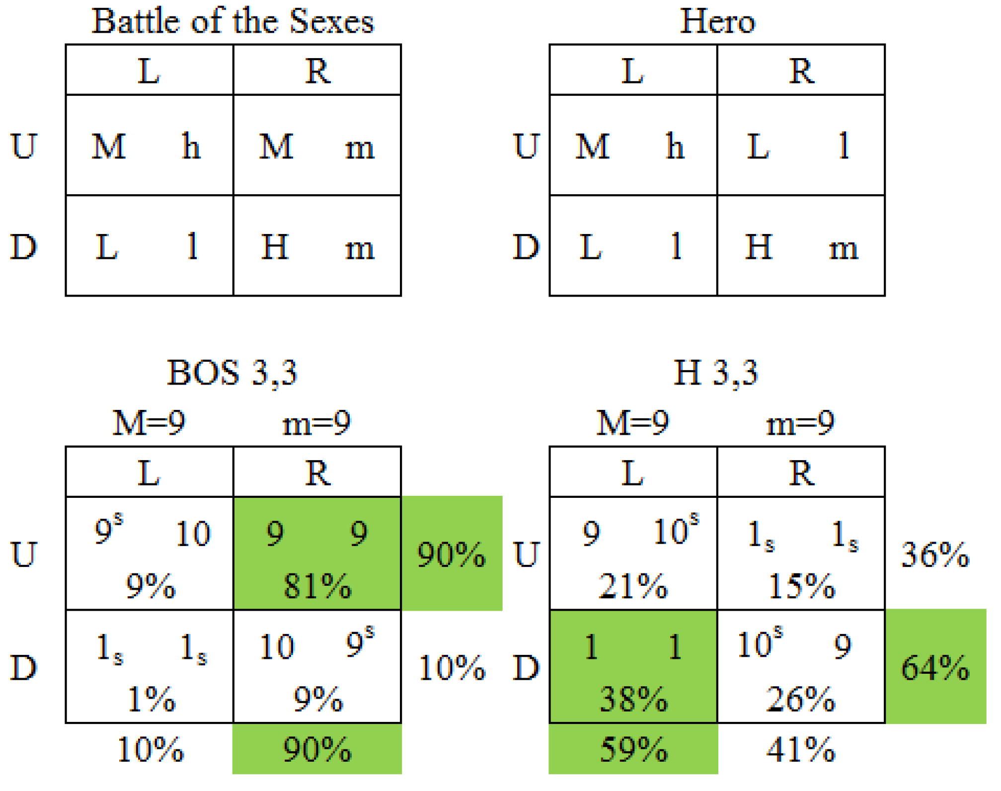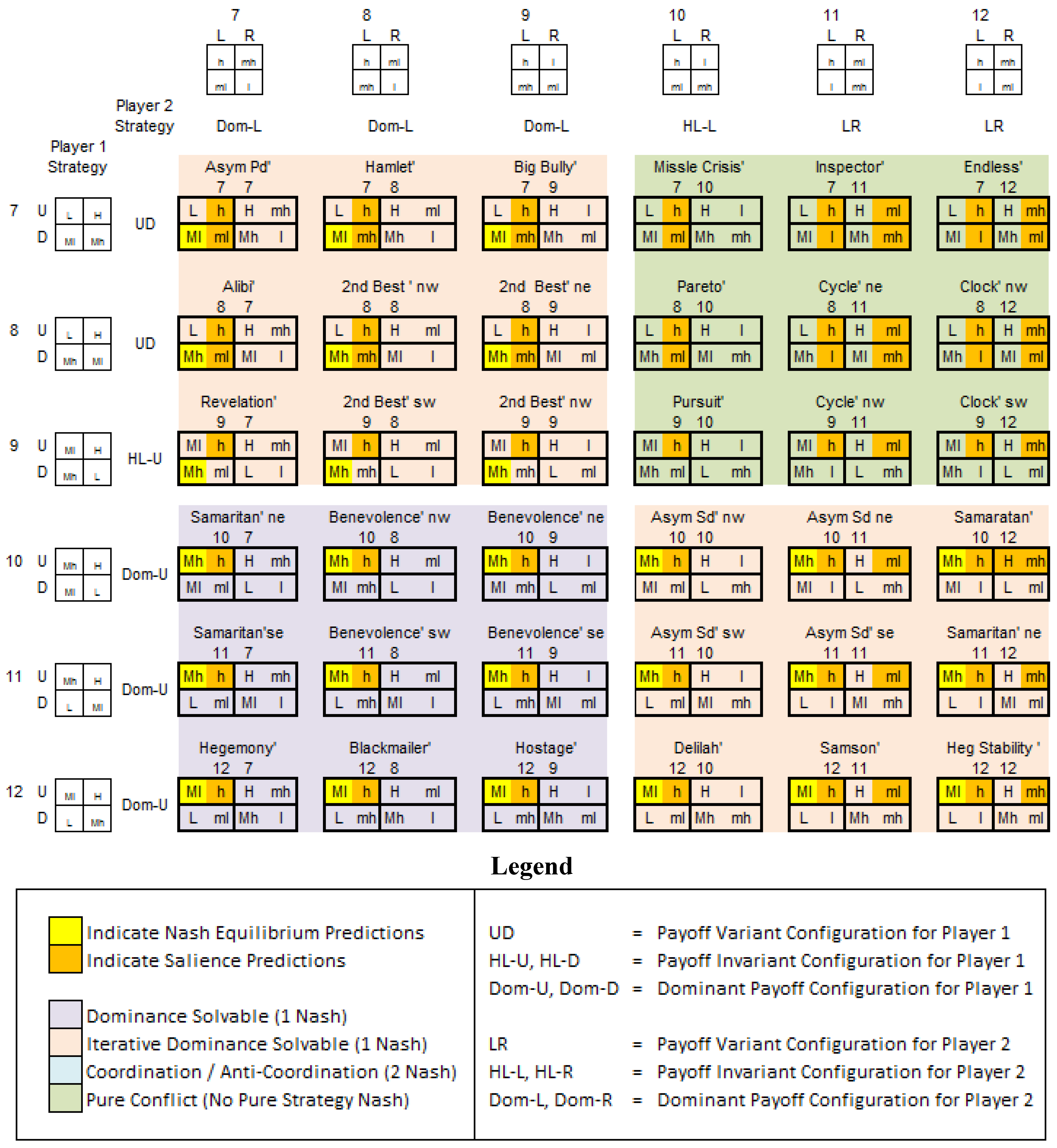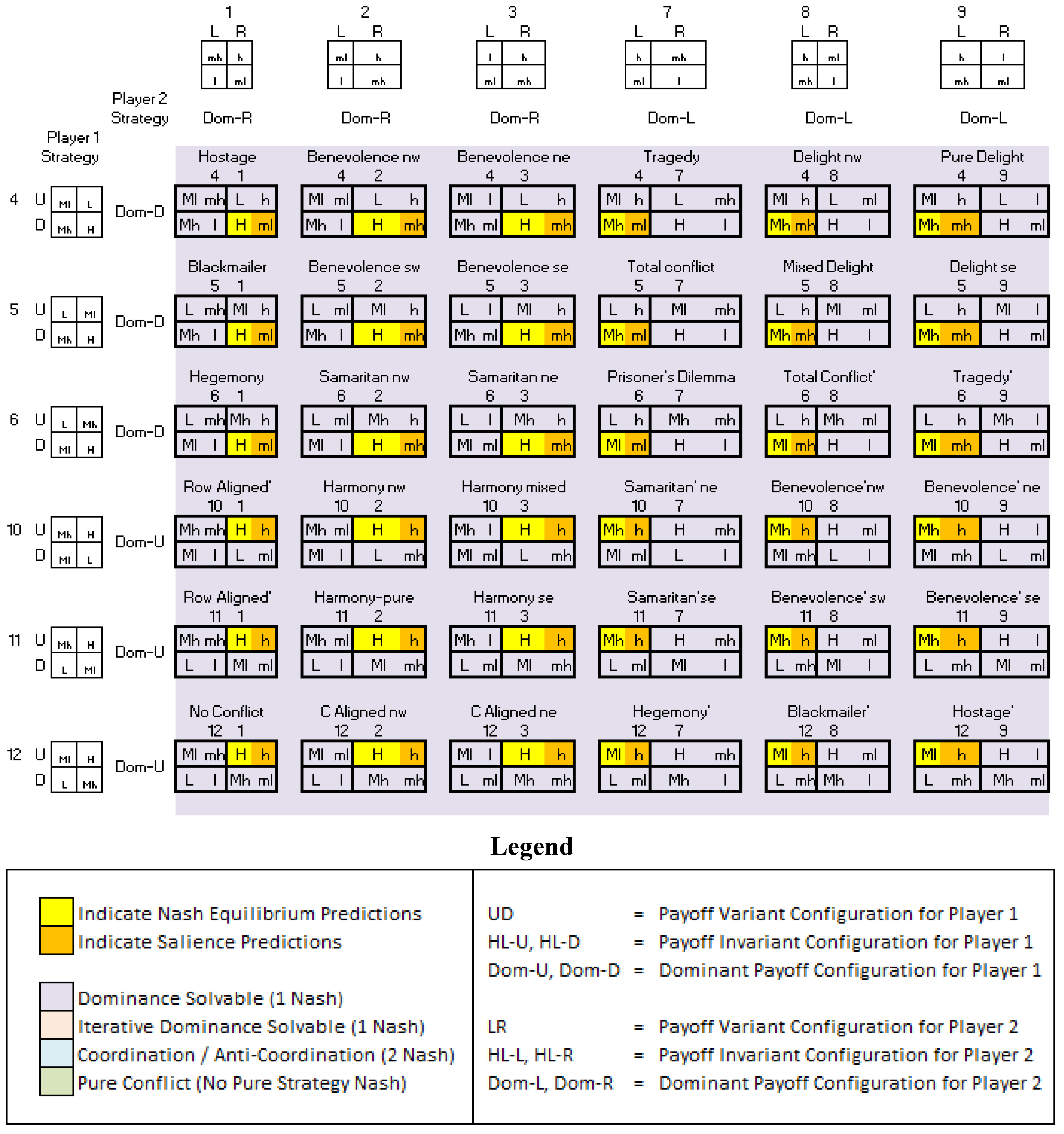 Figure 9 contains the games for which players face either HL or HI/IL payoff configurations. There are four games (those in the upper left corner of the matrix) where both players face HL payoff configurations. In these games, the model predicts that play will be invariant to the relative magnitudes of the payoffs (as is predicted for all games in traditional game theory). The predicted outcome in the Coordination sw game on the lower left corresponds to the payoff dominant Nash equilibrium. In the anti-coordination Hero game to the upper right (a variant of the Battle of the Sexes game), the predicted outcome is neither of the Nash equilibria. The other two HL/HL games are cyclic games in which there are no pure strategy Nash equilibria. In the remaining games in Figure 9 (all involving either coordination, anti-coordination or cycles), own-payoff salience predicts either two or four outcomes as a function of the relative values of the intermediate payoffs for one or both players.6