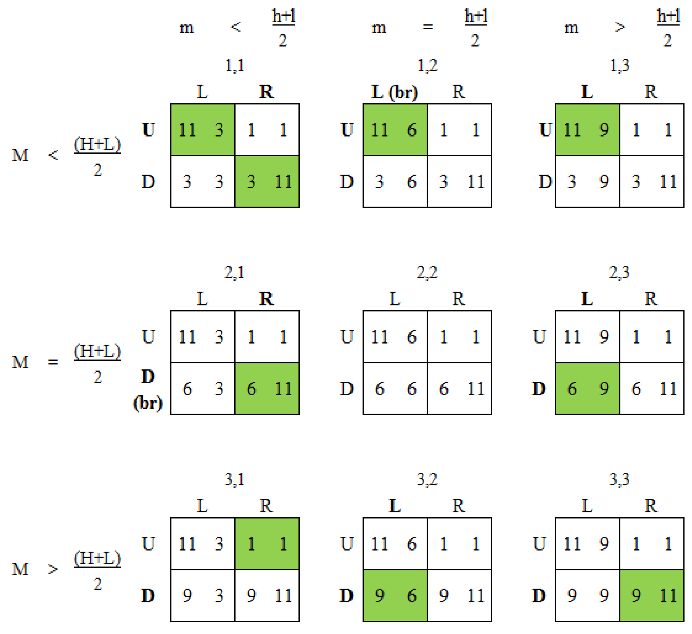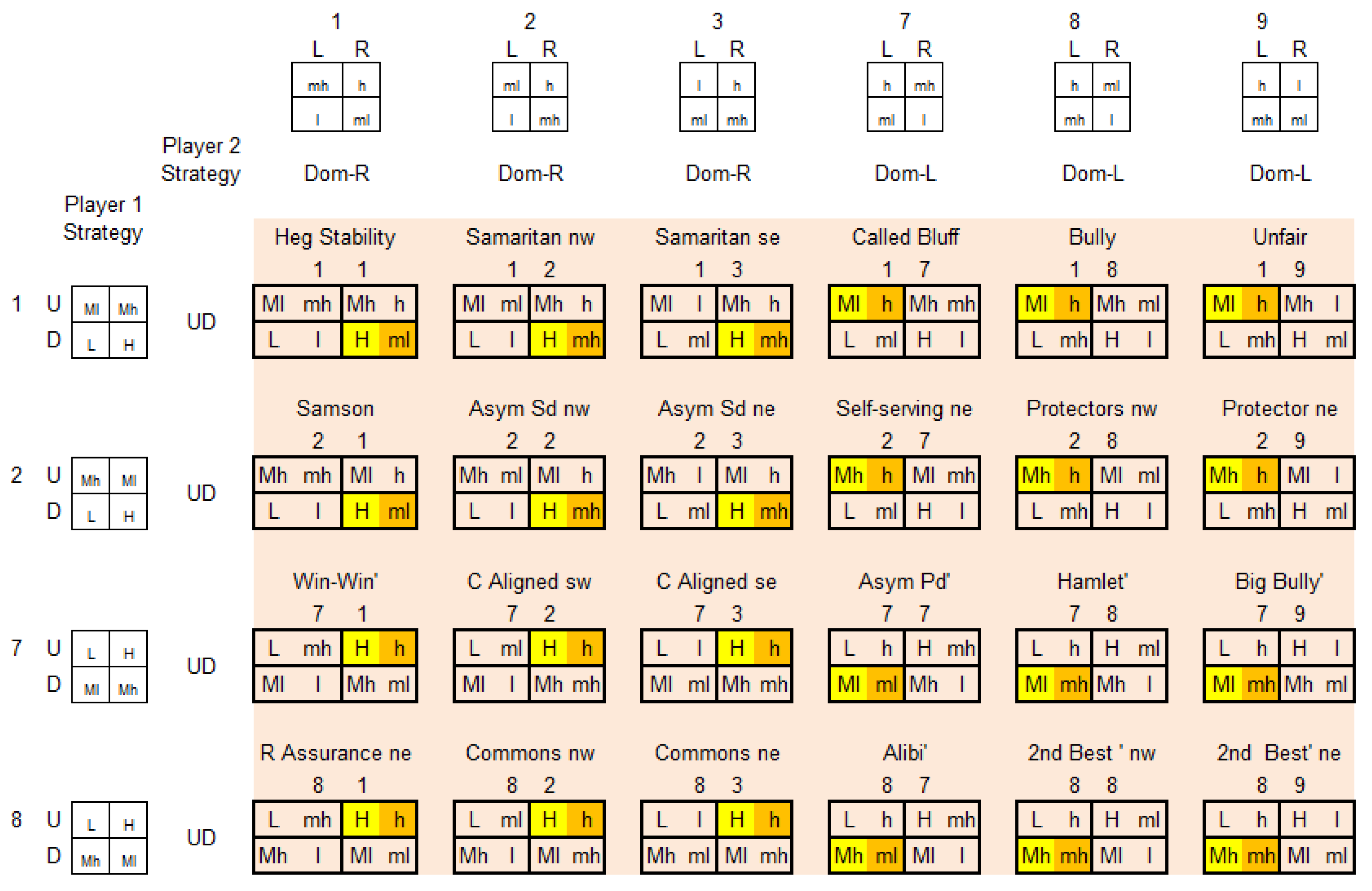 For two other payoff configurations facing either player, the largest and smallest payoffs are juxtaposed. For these configurations, labeled H(igh)L(ow), the strategy corresponding to the larger payoff will be selected and this will be true independent of the values of the other payoffs. Payoff configurations for which this is the case are denoted HL-U(p) and HL-D(own) in the column labeled “Player 1 Strategy” and HL-L(eft) and HL-R(ight) in the row labeled Player 2 Strategy.