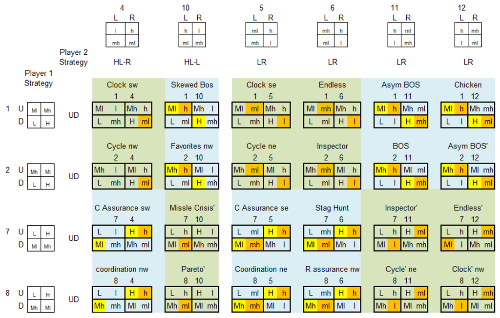 - Kilgour, D.M.; Fraser, N.M. A Taxonomy of All Ordinal 2 × 2 Games. Theory Decision 1988, 24, 99–117. [Google Scholar] [CrossRef]