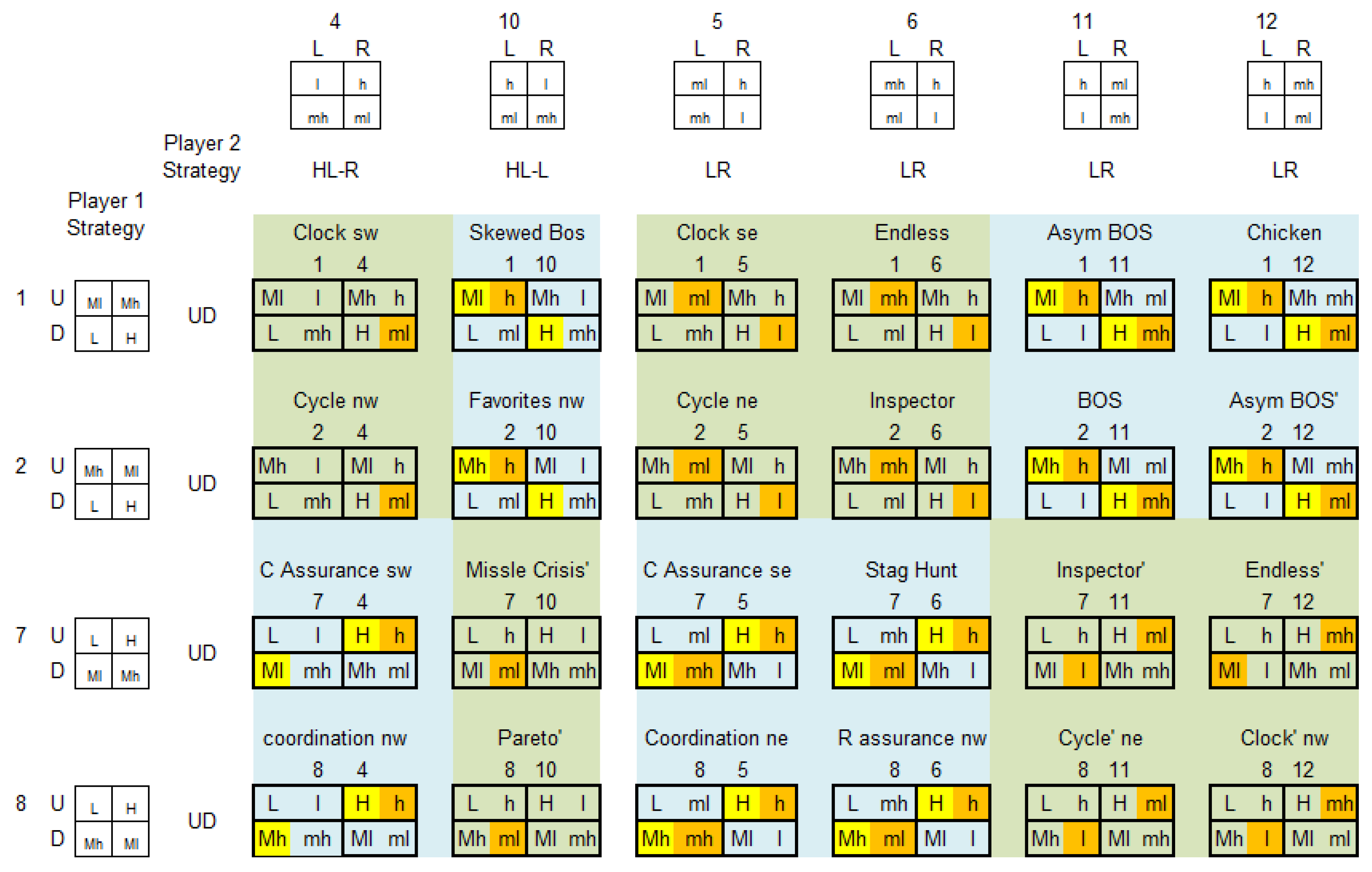 The class of 144 strictly ordinal 2 × 2 games (games 1–7 through 6–12).