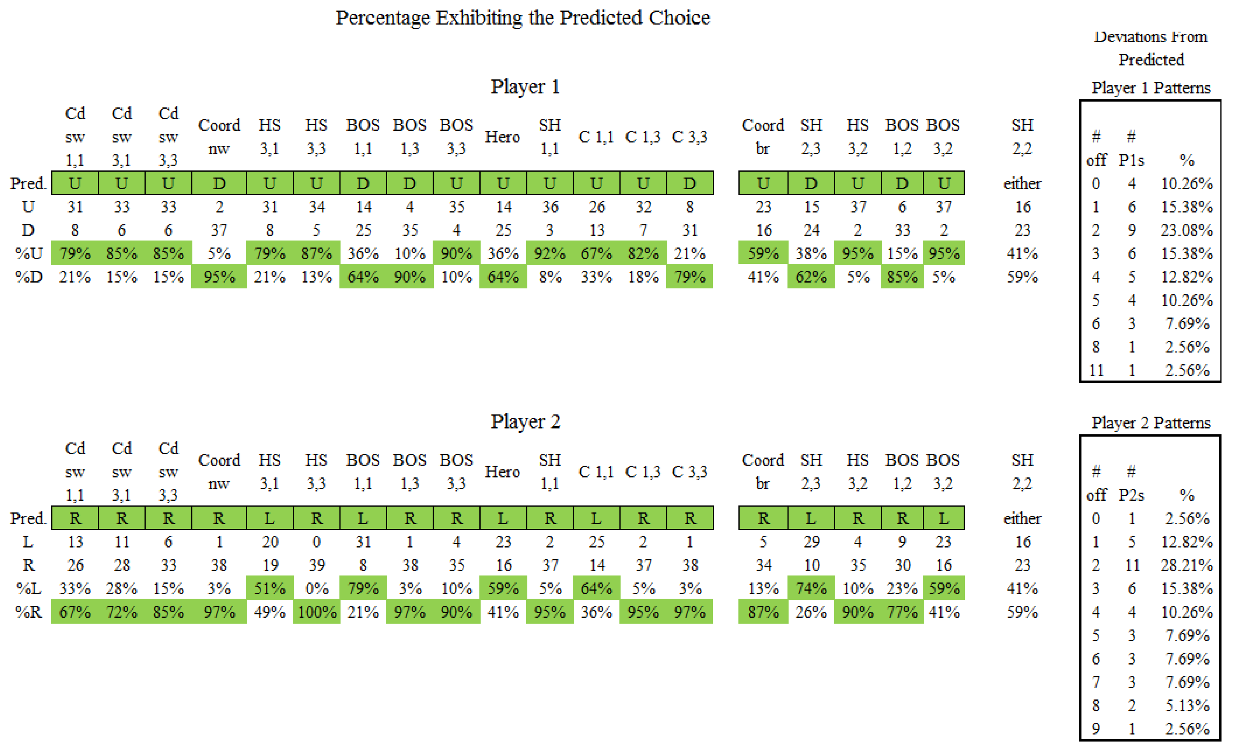 - 18Although the modal pattern for Player 1s appears to be two off the predicted pattern in Figure 20, Player 1s were two off the predicted pattern in different ways such that the modal response pattern apparently exhibited by nine subjects conceals the fact there were several different response patterns by which Player 1s differed by two choices from the predicted pattern. A similar observation holds for Player 2s.