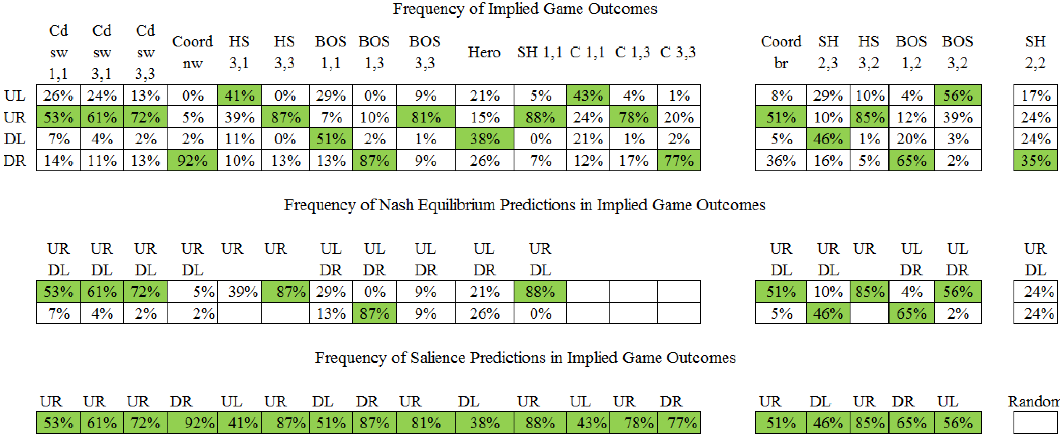 Taken as a whole, the results reported may explain why the outcome in certain strategic interactions seems stable in some cases (in payoff invariant games) but unstable in others (payoff variant games), amicable in some cases (i.e., Coord sw) but intractable in others (the Hero game). In this respect, the model presented here accounts for a different notion of stability than that captured by Nash equilibrium: Nash equilibria are robust to unilateral deviations from a best-response profile for rational players, but are not necessarily robust to changes in cardinal payoffs for salience-based players. It is possible that the notion of payoff invariant games provides a stability concept for single-shot games, whereas Nash equilibria may be more predictive for long-run or repeated interactions.
