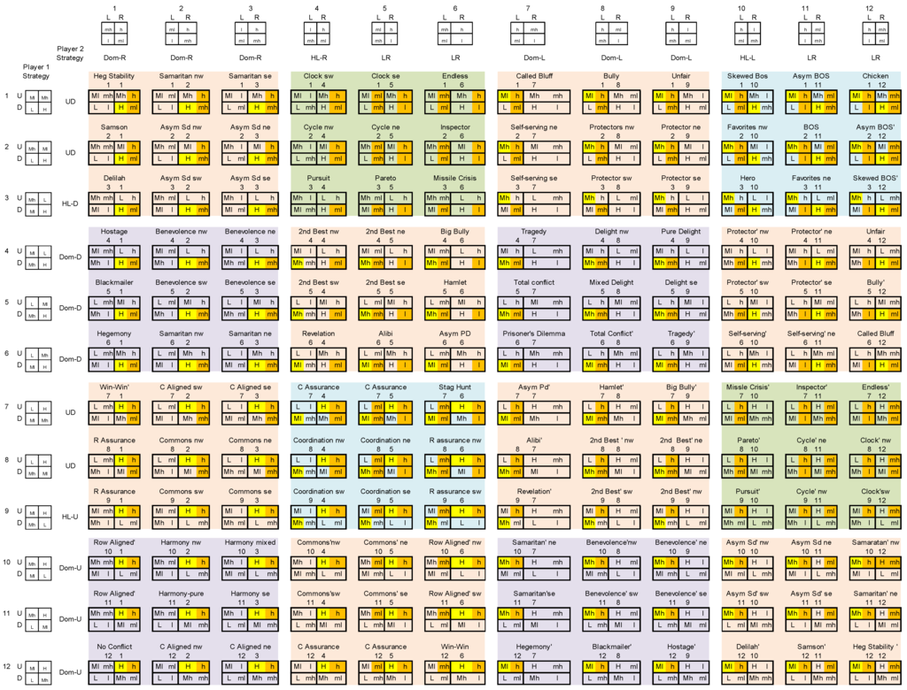 - 7Here again, the model suggests that we may be able to engineer the outcome that obtains in strategic settings by using side-payments or penalties to convert a HI/IL payoff structure to a Dom or HL structure for which one of the Nash equilibrium outcomes is assured.