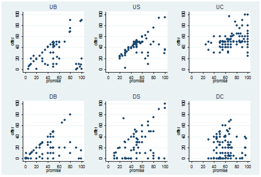 In addition to identifying an offer–promise relationship in the aggregate, we also estimated offer promise relationships separately for all our conditions. In these regressions, not reported here, we find that offers are positively affected by promise at the five percent level for US and UC but no significant offer promise relationship for UB. Interestingly, the results from the dictator games are exactly in the opposite direction and the DB condition displays credibility at the one percent level, whereas there is no significant offer promise relationship in DS and DC11.