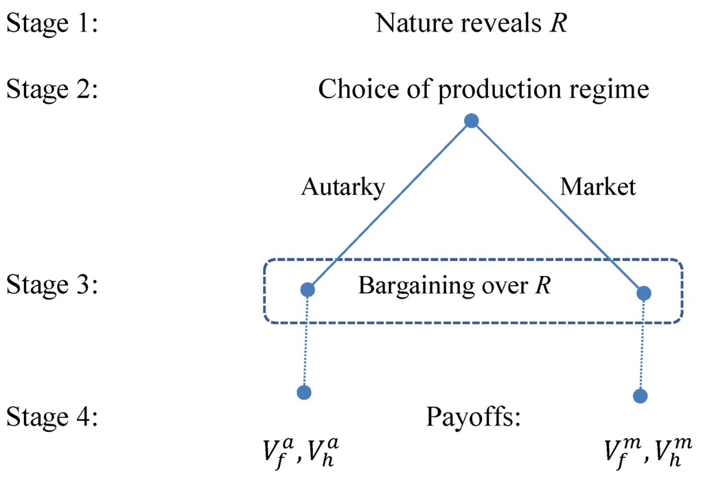 The key choices that we model below are, first, the choice of production regime (i.e., autarky or specialization with market exchange) and, second, the allocation of the resource between groups. We argue that it is reasonable to think of them as a joint decision where the choice of production regime is made by the groups, taking into consideration the effects that this choice will have on the subsequent division of the resource. In autarky, there is no matching of interests, and the division of the rival resource is conflictual. In a market regime, the groups become interdependent through trade, and the division of the resource will be made in the joint interest of all parties. The groups consider these two options when they make the first fundamental decision about the production regime.