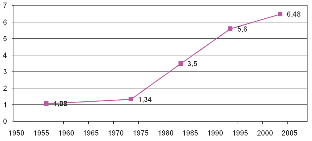 - 21.More specifically, let us normalize effective resources (land) per capita in 1973 to be 1/1 = 1. Whereas effective land depreciated by a factor 1,2 due to drought, total population increased by a factor of 4,836. Hence, effective resources per capita in 2003 are (1/1,2)/(1*4,836) = 0,172, i.e., slightly more than of the level in 1973.