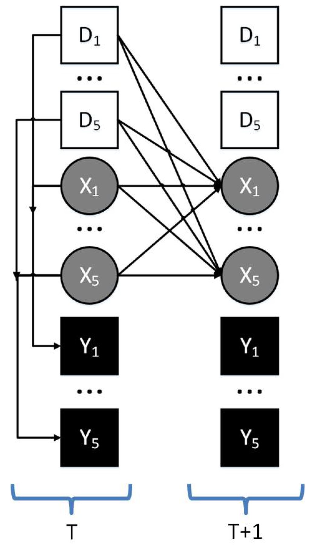 In the unmodified DBN, the distribution over all of the states at step t, is a by one vector. Additionally, the size of movement matrix A, which is the transition matrix from all of the input and hidden state combinations at the current step to the state at next step, is . After marginalization, the marginals for each target i in the hidden state are , which is a vector of size C. After we marginalize the hidden states, we only need to keep N marginals at each step, i.e., consider only N parameters. At each step, we can recover the distribution of the full state by multiplying the marginals at this step. Then, we get the marginals at the next step by evolving the recovered joint distribution of the state at the current step. Therefore, A can be expressed as a matrix, where .