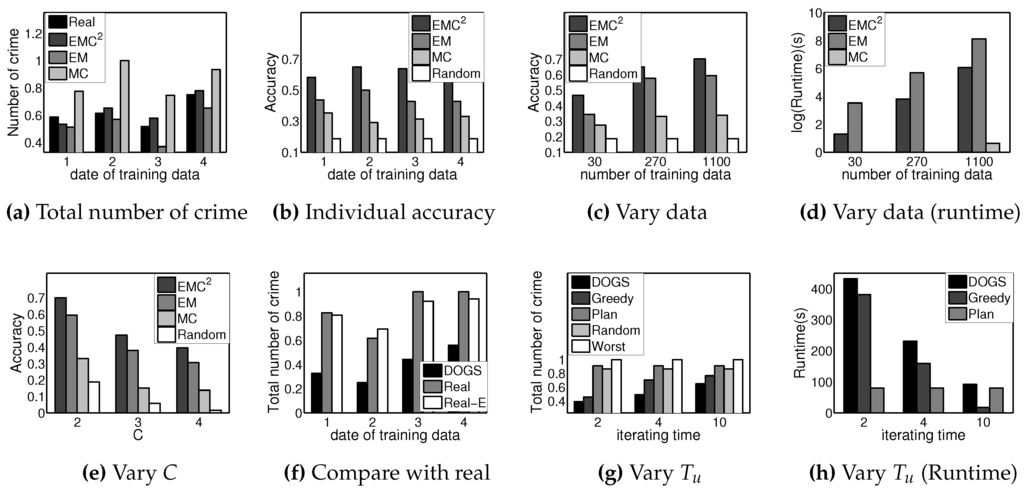 In Figure 5e, we compare the four approaches by varying C. The x-axis shows the value of C. We use 1100 data points for training, while 30 data points, which are just after the training data points, are used for testing. The accuracy decreases as C increases. This is because when C increases, there are more possible values of the number of crimes. Thus, the possibility of predicting an accurate number decreases. However, when C increases from three to four, the decrease in accuracy is small in EMC due to the fact that data with a value of four rarely appear in both the crime and patrol dataset. This indicates that a small C is a good approximation. In addition, the EMC algorithm again outperforms all other algorithms for any C.