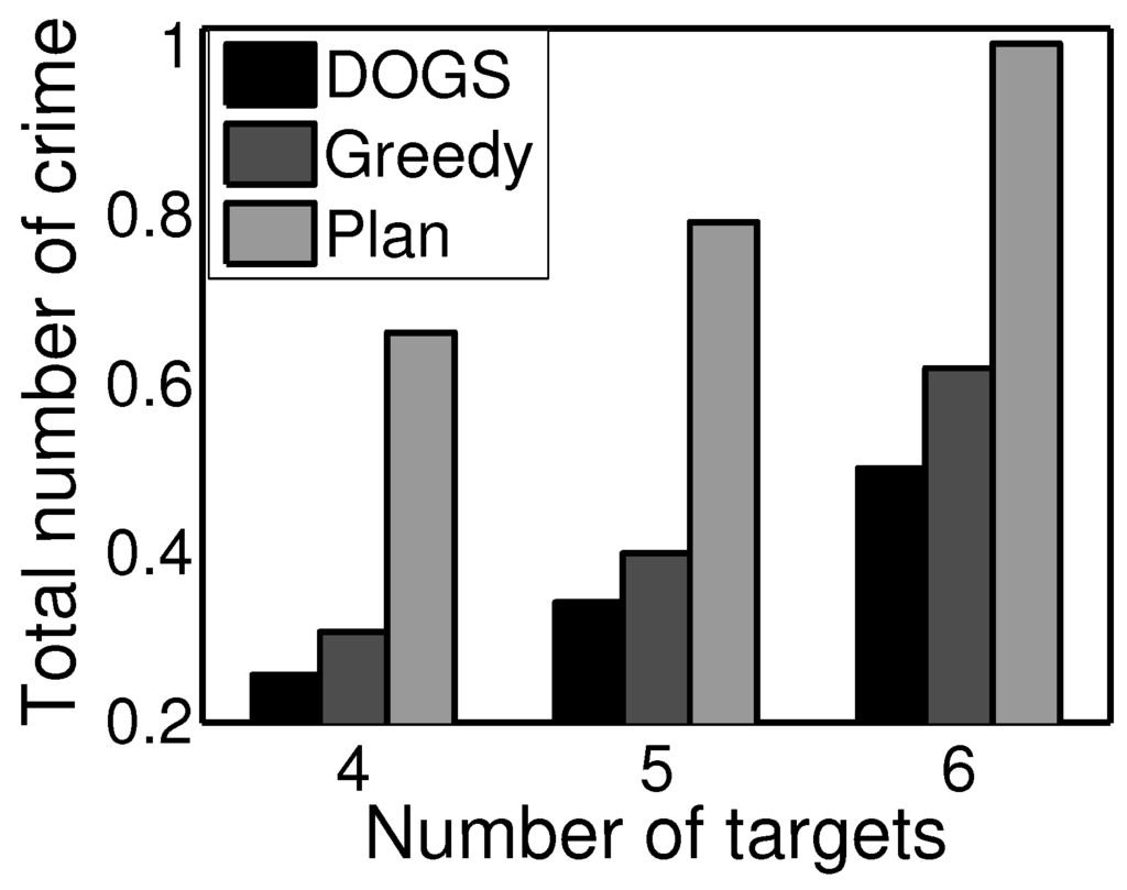 In Figure 5g, the total planning horizon T is set to 600. In addition to the four planning mechanisms, we also consider the worst case where the defender always protects the least valuable targets. The x-axis shows the update interval , which is the time interval after which we update the criminals’ behavior model. The y-axis is the expected number of crimes that happen under the deployed allocation strategy within 600 steps. The expected number of crimes under the pure planning mechanism stays the same with different , because it does not update the criminals’ model at all. For the online mechanisms, the expected number of crimes increases as the update interval increases. This is because with infrequent updates of the criminals’ behavior model, we cannot keep up with the real criminals’ behavior. In addition, with any size of the update interval, the DOGS algorithm outperforms the greedy algorithm. In Figure 5h, we present the runtime of three mechanisms for the same experiment. We do not show the runtime for the random planning mechanism, as it is small and the same for any planning horizon T. The runtime decreases as the update interval increases. There is a runtime-quality trade-off in choosing . Figure 7 shows the performance of the four planning mechanisms, but with different numbers of targets in the model. The x-axis is the number of targets in the graph, and the y-axis is the expected number of crimes under the deployed strategy. We set , . The results here are similar to the results of Figure 5g.