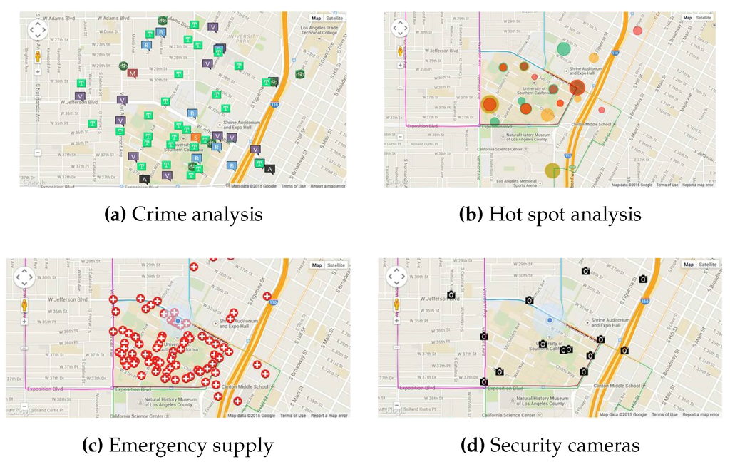 Second, the data collector provides information to the officers in the field about various available resources, such as emergency supplies and security cameras. As shown in Figure 8c, our software indicates the location for all of the emergency supplies on campus. Figure 8d shows the (mock) location of security cameras. To check certain locations, officers can use our software to watch the video from any camera. Finally, the data collector provides input for the patrol scheduler. By reading the data from the collector, the patrol scheduler can continuously learn and update criminals’ behavior.