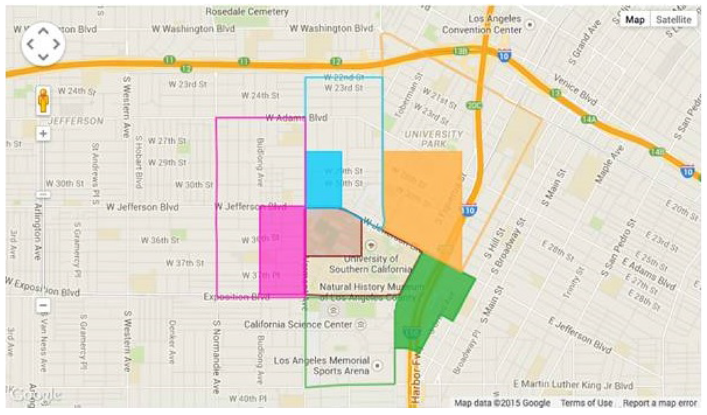 Patrol settings: At USC, our approach further divides the enforcement area (encompassing the campus) into 18 patrol areas, which are shown in Figure 9. DPS patrols would be in shifts of 4 h each. At the beginning of each patrol shift, our algorithm assigns each available patrol officer to a patrol area, and the officer patrols this area in this shift.