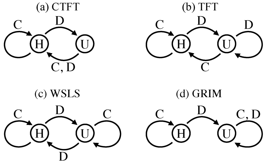 In the error-free limit, the opponent’s states and actions have a one-to-one relationship, i.e., H to C and U to D. Thus, the state transitions of a PFSM can be denoted as , where is the opponent’s next state when the agent’s previous action was and the opponent’s previous state was . Using this notation, the state transitions of GRIM and WSLS can be denoted by HUUU and HUUH, respectively. Given this, in , we can rewrite the opponent’s present state s with present action r and previous state with previous action by using the one-to-one correspondence between states and actions in the error-free limit. Moreover, from the opponent’s viewpoint, in can be rewritten as , which is the agent’s pseudo state; here, because of the one-to-one relationship, the agent appears as if the agent had a state in the eyes of the opponent. In short, we can rewrite as in Model 1 and as in Model 2, where we flip the order of the subscripts. This rewriting leads HUUU and HUUH to CDDD and CDDC, respectively, which are part of the optimal decision rules when playing against GRIM and WSLS; GRIM and WSLS can be optimal when playing against themselves depending on the payoff structure. The above interpretation suggests that some finite-state machines, including GRIM and WSLS, would form equilibria in which a machine and a corresponding decision rule, which infers the machine’s state of mind and maximizes the payoff when playing against the machine, behave in the same manner.