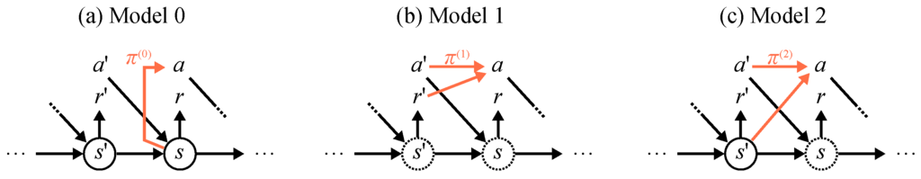 Different policies of the models. Depending on the given model, the agent’s decision depends on different information as indicated by orange arrows. At the present stage in which the two players are deciding actions a and r, (a) policy depends on the opponent’s present state s, (b) policy depends on the agent’s previous action and the opponent’s previous action and (c) policy depends on the agent’s previous action and the opponent’s previous state . The open solid circles represent the opponent’s known states, whereas dotted circles represent the opponent’s unknown states. Black arrows represent probabilistic dependencies of the opponent’s decisions and state transitions.