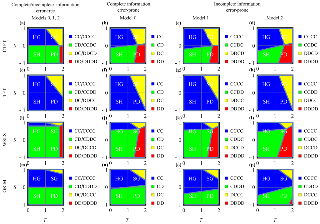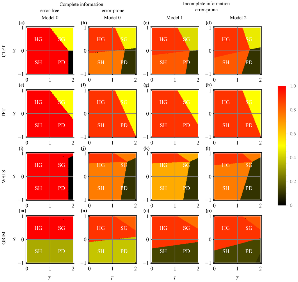 Frequency of cooperation with an intermediate future discount. Here, the opponent obeys (a–d) CTFT, (e–h) TFT, (i–l) WSLS and (m–p) GRIM. (a,e,i,m) Error-free cases (; in the cases of GRIM, this is achieved by setting and taking the limit ) of complete information (i.e., Model 0). (b,f,j,n) Error-prone cases () of complete information (i.e., Model 0). (c,g,k,o) Error-prone cases () of incomplete information (i.e., Model 1). (c,g,k,o) Error-prone cases () of incomplete information (i.e., Model 2). Horizontal and vertical axes represent payoffs for one-sided defection, T, and one-sided cooperation, S, respectively. In each panel, HG, SG, SH and PD indicate the regions of these specific games. We set parameter .
