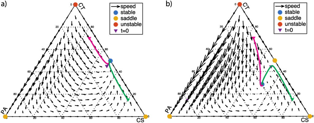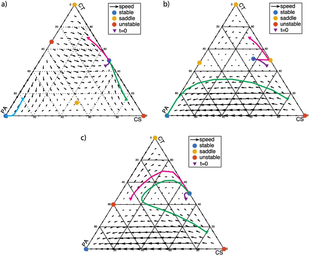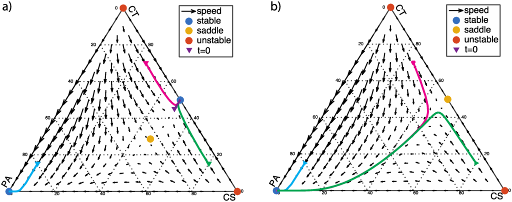 The flow-field diagram of population frequencies as shown in Figure 1 provides an overview of the dynamics of this scenario. In Figure 1, the solid lines indicate the dynamic progression of three different starting populations versus time. The three starting points are chosen to correspond to healthy human controls because pathogenic bacteria such as C. difficile is typically about 5% in clinical samples [20] (p. 9). Near the equilibria, the progression of the dynamics becomes slower. From a clinical perspective, the ideal goal is to eradicate pathogenic bacteria (PA) or at least reach stability with low fraction of PA. Figure 1a shows an ideal condition (α < β + 1), in which PA-free coexistence of CT and CS cells is a stable fixed point. When α > β + 1, the PA, CT, and CS cells coexist at equilibrium, as shown in Figure 1b. This is an acceptable condition clinically since the ratio of three phenotypes reaches a balance regardless to initial population fractions.
