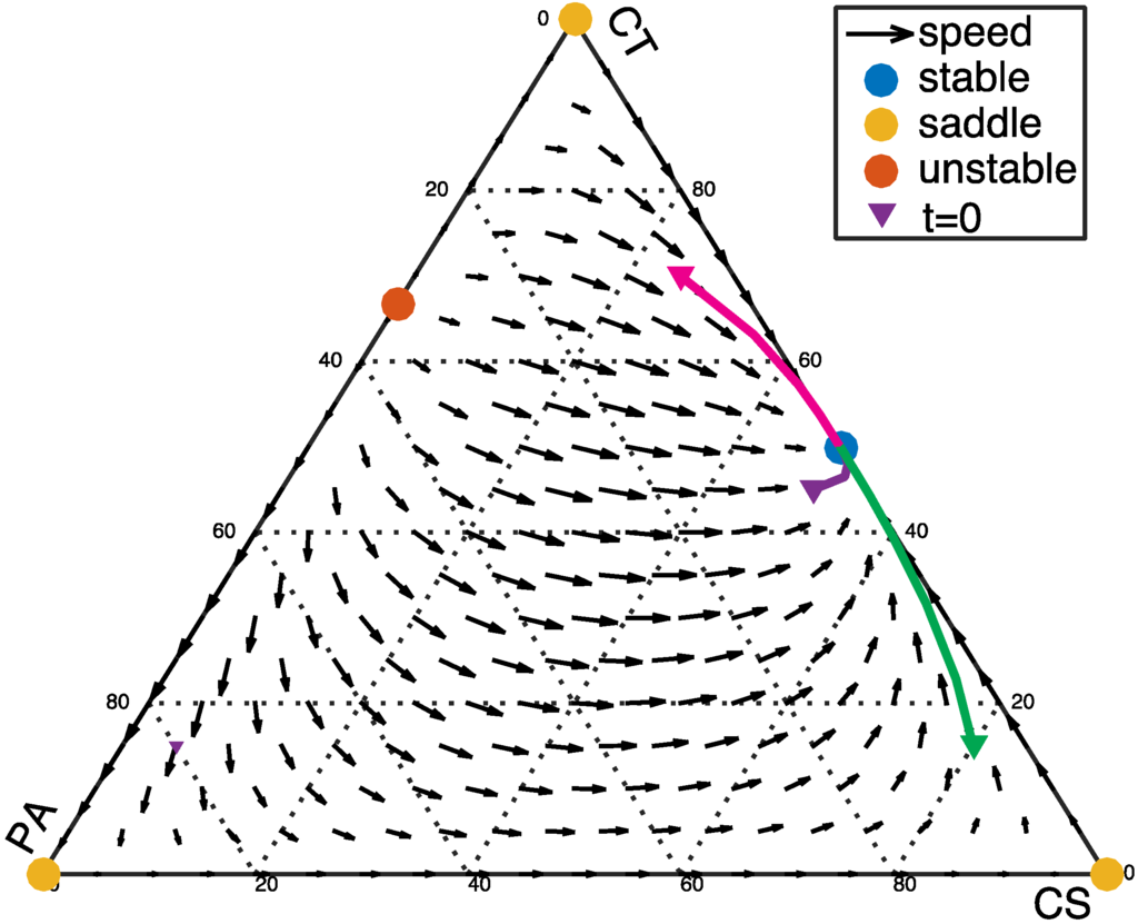 On the other hand, the CT and CS bacteria might both suppress the growth of the PA bacteria by producing toxins or through competition for attachment sites and nutrients. In this case, both the CT bacteria and the CS bacteria inhibit the growth of the PA population (α < 0 and β > 0). Again, the system will have only one stable fixed point, on the edge of the simplex at (1/2, 1/2, 0), corresponding to a healthy state with no PA bacteria present. The dynamic progression with various initial population fractions is shown in Figure 2. Regardless of the initial population fractions, the system returns to a healthy state with CS and CT dominating the community.