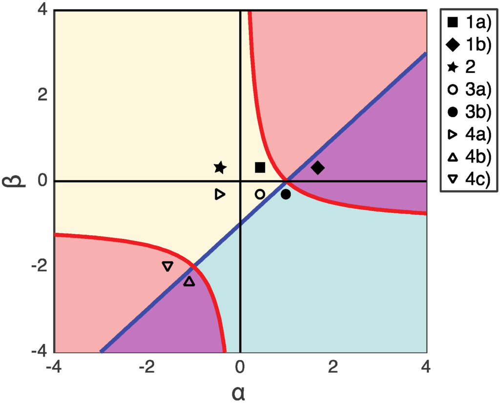 We have discussed various scenarios based on the relative gain or loss of fitness of the PA phenotype represented by the values of α and β. In Figure 5, we summarize the results, indicating regions of the α vs. β phase diagram with a single stable fixed point (solid markers), and those with bistability (open markers) in the dynamical system. The question of whether there is one or two stable fixed points is important because that will determine how much perturbation of microbial composition can be tolerated by the host system. The parameters α and β together with population composition determine if the system is able to recover from an abrupt dysbiotic state caused by pathogenic invasions or antibiotic disturbance [21] (p. 9).