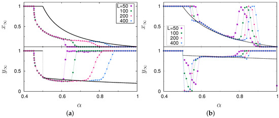 Multiplying the numerator and denominator of Equation (3) by we see that in order to have , otherwise is attracted either to 0 or 1. Analogously, for in Equation (4) it is necessary that . Thus, the asymptotic state is determined only by the signs of , , and [30]. While is always positive, , and change sign at , and , respectively, locating the mean-field transition lines between the diverse phases of the system. The homogeneous, absorbent phases occur either when ( or ) or (). The only region left is and . In this region, from the stability analysis [33], the system evolves along closed orbits around the center and the strategies 0 and 1 coexist. It is interesting to notice that fully individualistic (00) sites are only possible, along with the other strategies, in this coexistence phase. As expected, preys are grouped when α is small and collective hunting is very ineffective against them, whatever the value of β. Similarly, for small values of β it does not pay to hunt alone, leading to cooperating predators for all values of α.