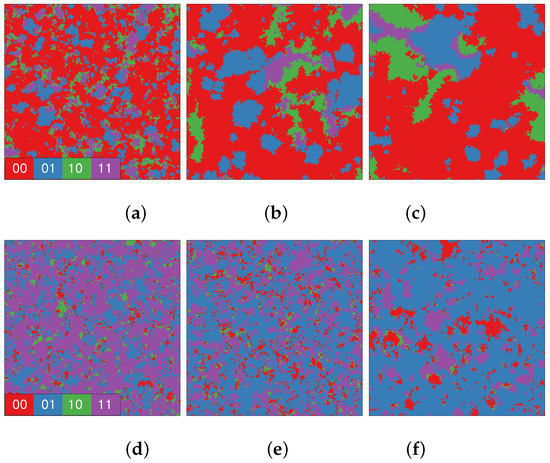 Another convenient local variable is the combination whose possible values are 00, 01, 10 and 11. Examples of their spatial distribution are shown in the snapshots of Figure 2 for different values of α and β. For and those values of α (a-c), and are small and most of the sites adopt individual strategies (00), being organized in a large, percolating cluster. The (finite) system is said to percolate when at least one cluster spans it from side to side. For and away from the transition where finite-size effects are important, is large with most of the preys behaving collectively. Thus, 11 and 01 strategies are more frequent, while clusters of 00 and 10 are small or rare. Here we present some new results for the percolation properties of the different relevant clusters seen in Figure 2, discussing the origin of such differences and their role in the finite-size effects as well. The densities of these strategies, (), are obviously related to and by and and can quantify what was illustrated by the above snapshots.