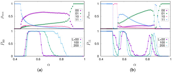 Figure 3a shows that the 00 strategy is the dominant one within the considered range of α. The sites with that strategy are spatially distributed forming the percolating background on top of which the other, smaller clusters interact. Indeed, the fraction of samples with a percolating 00 cluster is up to a size dependent value, , where drops to zero. This point coincides with the value of α where the system is absorbed by the (0,1) phase (Figure 1a), indicating that these finite-size effects are correlated to this percolation event. This is not an actual percolative transition, but a crossover behavior that disappears for very large systems, . As mentioned above, the behavior may change for different values of α and β. Indeed, for (Figure 3b), besides two different absorbing states, (1,0) close to the transition and (0,1) for large α, there is a small overshoot region in which the preys turn to collective behavior and the frequency of 11 sites has a sudden increase. The origin of this rich behavior can be traced to the heterogeneous nature of the competition, where which effective strategy is a prey and which is a predator changes along with the parameters α and β.