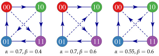 In Ref. [4], through specially designed initial conditions, the direction of the invasions were obtained. A circular patch with one effective strategy embedded into a sea of a different strategy were let to evolve and the direction defined by which strategy is suppressed while the other thrives (by switching their positions, the invasion was also in the opposite direction, ruling out the curvature of the interface as the driven mechanism). Figure 4 combines this information for some points inside the coexistence phase into a flux graph, similar to recently studied generalizations of the RPS game involving more than three species [1,2,37,38]. The only difference between these graphs is the orientation of the diagonal arrows. Other combinations of α and β may present further inversions as well [4]. These graphs help to understand the origin of different dynamics and asymptotic states for different points , as shown by the two cases in Figure 3. Although the model does not consider mutations as a possible mechanism to re-inject extinct strategies, the effective strategies reproduce in a way similar to diploid organisms, and when two strategies along any of the diagonals of the flux graph are present, all other strategies may result. For example, consider an initial state with only 01 and 00 strategies. It is not possible to create the strategies with because for all sites. On the contrary, with a mixture of 01 and 10 (or, equivalently, 00 and 11), all four strategies may be obtained with their recombination. Starting from a random initial state in which all four strategies are equally present, their time evolution may be represented by an orbit inside the 3-simplex (the configuration space left invariant by the dynamics). Thus, any edge connecting the vertices of the 3-simplex that correspond to the arrows on the outer perimeter of the flux graph is absorbent. All other regions of the simplex, including the edges that correspond to the diagonals, do not absorb. Notice that for the typical generalizations of the RPS game involving four or more species, the whole hull of the simplex is absorbent, while here only some of its edges actually absorb.