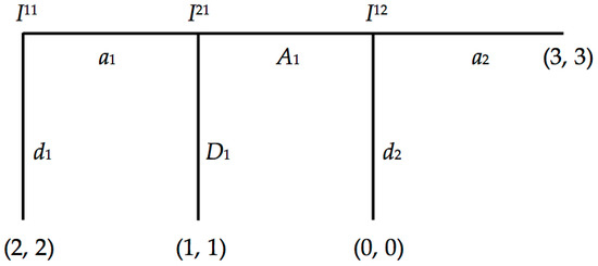However, it does not, together with the probability axioms and conditionalization, compute a unique credence distribution. Suppose each agent begins the game with a Cr = 1/n for a number n of an opponent’s available strategies. The second agent is assigned Cr = 1/8, while the first agent is assigned Cr = 1/4 for each of his opponent’s available strategies. Suppose the first agent chooses and acts on a1 at I11, and the second agent must decide whether to choose D1 or A1 at I21, which depends on whether the first agent will choose d2 or a2 at I12. The second agent’s choice is between his opponent’s four remaining available strategies: (a1a2a3), (a1a2d3), (a1d2a3), (a1d2d3). It is important to recognize that the act a1 at I11 is evidence that alone does not favor any particular strategy over another in the remaining set of available strategies. The second agent, thus, applies conditionalization on said evidence and evenly assigns credences to those strategies (the evidence does not favor one strategy over another). This is a reasonable application of the principle of indifference. It states that an agent updates his credences proportionally to the evidence, and no more [42]. The second agent applies conditionalization upon the current evidence of a1 at I11, and has Cr = 1/4 in strategies (a1a2a3), (a1a2d3), (a1d2a3), (a1d2d3). Removing acts that have occurred, he has Cr = 1/4 in (a2a3), (a2d3), (d2a3), (d2d3). The principle of indifference guides the second agent’s judgment of his opponent’s future choice of action. It is an additional rational constraint to regularity, to the probability axioms, and to conditionalization.