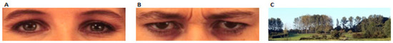 The presence of eyes was manipulated as a within factor, and involved showing a picture of either kind eyes, unkind eyes or a rural landscape (see Figure 2A–C) in randomized order above the decision matrix: one type of cue in each of the three rounds of decision making. This procedure is similar to that of previous published research (e.g., [13,14,19]), except that we (a) specifically selected eyes with opposing valences, while previous research has not yet made a clear distinction between eyes with different valence; and (b) used a picture of a landscape instead of images of flowers, which are typically used as a control. The landscape was meant to avoid connotations of flowers as a symbol of kindness and gifts. The pictures of kind and unkind eyes were obtained from an already validated database of emotional faces [47]. Both pairs of eyes belonged to a female face, and were cropped to show only the area around the eyes. We additionally validated the stimuli in a small pilot study to verify that they conveyed kindness and trustworthiness (Figure 2A) and unkindness and untrustworthiness (Figure 2B).