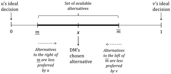 Since available options may lay at interior locations on the interval, when the DM takes an action that is not “ideal,” she experiences a disutility cost. By simplicity, we assume that this cost of unachieved ideals is quadratic, so the individual utilities are given by: