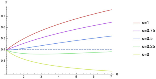 Figure 1 shows the unique symmetric Nash-equilibrium contribution in the public goods game between moralists, , as a function of community size n, for different degrees of morality, with higher curves for higher degrees of morality. This is also the unique symmetric Nash-equilibrium contribution in the public goods game between altruists, , when the degree of altruism is the same as the degree of morality, . Hence, the behavioral effects of morality and altruism are here indistinguishable.