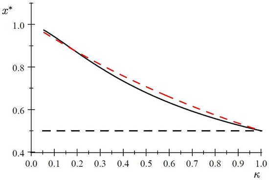 We proceed by considering the numerical example that we studied under altruism. Let thus and , and assume that (which guarantees an interior solution, both for and ). We use the approximation , indicated by the dashed curve in Figure 4. This gives the approximation