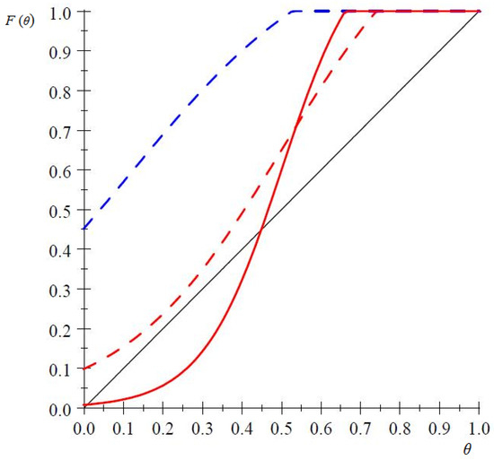 Figure 8 below shows three different CDFs. The two dashed curves represent relatively heterogenous populations, and those curves have one intersection with the diagonal, and hence the unique fixed point then is . The solid curve represents a relatively homogeneous population and this distribution function has three intersections with the diagonal, and thus three fixed points; one close to zero, another near 0.45, and the third one being . All fixed points are Nash equilibria in a continuum population, and are approximate Nash equilibria in finite but large populations. In the diagram, all fixed points except the one near 0.45 have index +1. Those equilibria are stable in plausible population dynamics, while the fixed point near 0.45 has index and is dynamically unstable.12