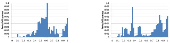 To perform learning on this formulation, we need to select a distance function to use between a pair of inputs as well as a distance (i.e., cost) between each pair of outputs. Standard metrics of Euclidean or Manhattan distance are not very appropriate for probability distributions. A more natural and successful distance metric for this setting is earth mover’s distance (EMD). While early approaches for computing groupings of hands used L2 [18], EMD has been shown to significantly outperform other approaches, and the strongest current approaches for game abstraction use EMD [19]. Informally, EMD is the “minimum cost of turning one pile into the other, where the cost is assumed to be amount of dirt moved times the distance by which it is moved”, and there exists a linear-time algorithm for computing it for one-dimensional histograms (Figure 3).