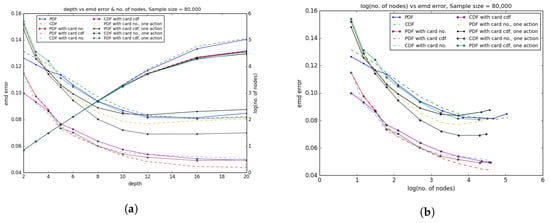 We created decision trees using 80,000 of the games from the database, using the standard division of 80% of the data for training and 20% for testing (so we trained on 64,000 games and tested on 16,000). We used Python’s built in decision tree regressor function from sklearn.tree from the scikit-learn library, which we were able to integrate with our new distance metrics. We constructed the optimal decision tree for depth ranging from 3 up to 20. From Figure 4a, we can see the errors of the optimal tree as a function of the depth, for each of the different data representations. Not surprisingly error decreases monotonically with depth; however, increasing the depth leads to an exponential increase in the number of nodes. Figure 4b shows how error decreases as a function of the (log of the) the number of nodes in the optimal decision tree.