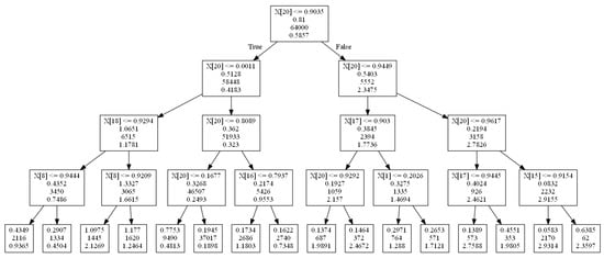 The optimal depth-4 decision tree for cdf input values, cdf value for a single card, and predicts a single bet size, is shown in Figure 5. At each node the left edge corresponds to the True branch and the right to the False branch. The node entries are the variable/value branched on, the error induced due to the current branch split, the sample for the current split, and the output (i.e., bet size) predicted (leaf nodes only contain the final three). For example, the far right leaf node says that if is false (i.e., player 1 has a hand with cdf value ), ..., if is false (i.e., the cdf value of a card 6 for player 2 is ), then output a bet size of 2.3597.