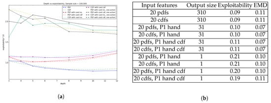 Figure 6a depicts the change in exploitability with respect to the depth of the decision tree. 310 output strategy outperforms 31 output vector strategy by a small margin whereas output with just the bet size in the last four representation produces relatively higher exploitability compared to the previous six comprehensive representations. Also later representations with just single bet size doesn’t result in smooth transition over depth for lower values due to the approximation in probability calculation considering only the most probable bet size, where there might exist other bet sizes for that particular hand with relatively smaller but positive probability. The table in Figure 6b shows exploitability and EMD error among the different representations with depth of the tree limited to 5. It is evident from the experimental result that all the representations produce relatively negligible EMD error and exhibit low exploitability, i.e., in the range 0.09–0.21 as the maximum possible exploitability is the highest bet value of 3. The last four representations with single bet value over each individual hand are more prone to exploitability as expected since the probability of betting the other 30 possible values are totally ignored. Third to sixth entry of the table with 20 pdf and cdf representation along with player 1’s individual hand, where the output strategy is the 31 probability distribution over each bet size of that particular hand, best optimizes the tradeoff between exploitability and interpretability.