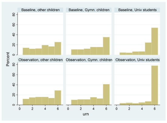 We found that university students significantly outperformed all children in both treatments (Mann-Whitney U-test, two-sided, for the Baseline and Observation treatments).4 Also, university students did better in the Observation treatment than in the Baseline treatment, as predicted by imitation (). In contrast, we did not find a significant difference between the Baseline and Observation treatments for the children, regardless of whether they were “Gymnasium” ( or other children ().5 Figure 2 plots the corresponding histograms of urn choices for the six different cells. In all six cells, the best urn is also the most frequently chosen one. The histograms also show that the incidence of the optimal urn vastly increases for university students when they receive additional information about another subject in the Observation treatment. This is not the case for children where, as shown above, the two distributions are not significantly different.