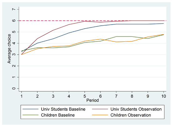 | 7. | Random effect regressions with clustered standard errors and a period variable (reported in Table A1 in the Appendix A) show that average choices for all groups in Figure 3 display a significant upward trend. |