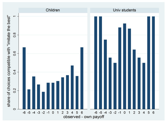Share of choices that are compatible with “imitate the best” depending on payoff difference (=observed payoff − own payoff from previous period).