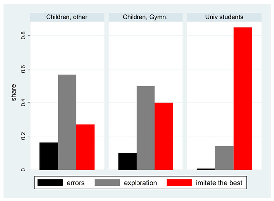 While the absence of treatment differences in children is strongly indicative of the absence of imitation, the evidence is, of course, indirect. Direct evidence can be obtained by examining how often subjects copy others’ behavior when others have found a better urn. We define the rule “imitate the best” as follows.8 Subjects always pick one of the actions that yielded maximal payoff in the previous period. If the partner’s payoff was higher, they should adopt the partner’s urn. If their own payoff was higher, they should stick to their own urn. If both obtained the same payoff, either urn could be chosen. All other urns constitute experimentation. In Figure 4 we show the percentage of choices that are compatible with “imitate the best” depending on the difference in payoffs (=observed payoff − own payoff). While university students stick to their choices when they have earned significantly more than the other player and imitate others with higher payoffs, the picture is much noisier with children. An MWU test comparing the distribution of the shares of choices compatible with “imitate the best” (taking each subject pair as one observation) across children and university students confirms this difference (). This becomes most apparent at the two extremes of the distribution of payoff differences where children display a much stronger taste for experimentation. They do not imitate the other’s action as much as one would expect when the difference in payoffs is 6 or 5, nor do they stick to their action as much as one would expect when they are actually the ones earning the maximum payoff difference of and . It is further insightful to classify deviations from the “imitate the best” rule as either errors or explorations. We define errors as clearly suboptimal behavior and explorations as behavior that is neither imitation nor an error. Given that feedback was only provided about round , we count the following as errors:9 If one sees a payoff of 7 in (as one’s own or the partner’s payoff), one should use the corresponding urn in t. If one does not, this counts as an error. Likewise, if one sees a 1, one should not choose this urn in t. Finally, if one sees payoffs from two different urns in (in the Observation treatment) and chooses the one with lower payoff in t, that counts as an error. This definition of errors partitions the choices into three categories: errors, “imitate-the-best”, and exploration. As one can see in Figure 5, children (in particular those not on track for “Gymnasium”) both make more errors and explore more. Note the monotonic relation of error rates, exploration, and imitation rates across subject groups.