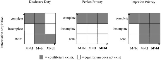 All equilibria we derived for Imperfect Privacy and Disclosure Duty remain. Figure 1 summarizes these findings. The figure illustrates that privacy institutions do not matter for testing if M < bI. Here only equilibria with complete information acquisition are possible. Since M = bI is a very unlikely assumption, we focus on the most interesting case (M > bI) where matches are ex-ante profitable for all agents in expected terms. Here, were find a unique Proper Equilibrium with no information acquisition in Disclosure Duty, and a unique Proper Equilibrium with complete information acquisition in Perfect Privacy. However, there exist multiple Proper Equilibria for Imperfect Privacy (for M > bI). Hence, the model does not provide a clear prediction with respect to the question whether Imperfect Privacy stops people from collecting information. Our experiment allows us to investigate whether behaviour under Imperfect Privacy coincides rather with behaviour under Perfect Privacy or Disclosure Duty.