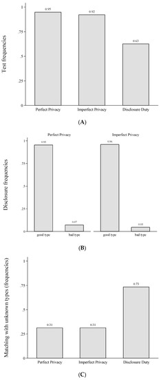 Panel B of Figure 2 shows that almost all tested good types disclosed their type in Perfect Privacy and Imperfect Privacy,21 whereas voluntary disclosure of bad types is rare.22 Following, almost all players in Perfect Privacy and (almost all players in) Imperfect Privacy who did not disclose their type, are tested bad types or untested players.
