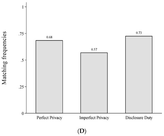 Finally, we analyse whether efficiency varies across the different privacy institutions. As each match generates a surplus, we can measure efficiency by the total frequency of matches. According to our parameters and the Proper equilibria in Figure 1 we should ex ante expect 100% matching in Disclosure Duty and 66.67% matching in Perfect Privacy. In Imperfect Privacy, the matching probability depends on the equilibrium that is selected. In the equilibrium with no information acquisition we should expect 100% matching, in the equilibrium with full information acquisition we should observe 66.67%. The mixed equilibrium strategies result in 68.57% matching for our parameter values. However, since information acquisition and transmission does not significantly differ in the two privacy institutions and people rarely make errors when matching with disclosed types in the behavioural data, differences in efficiency between Imperfect Privacy and Perfect Privacy are expected to be small. If at all we should expect slightly fewer matches (and thus lower efficiency) in Imperfect Privacy, because insurers can identify some tested but undisclosed bad health types in Imperfect Privacy, given data is disclosed involuntarily. As can be seen in Panel D of Figure 2, we find that matching tends to be less likely in Imperfect Privacy compared to Perfect Privacy (57 vs. 68 percent) but does not differ significantly (χ2-test, p-value = 0.267). Disclosure Duty yields the highest level of efficiency, since it results in the most matches but also fails to differ significantly from the other two institutions (Disclosure Duty vs. Imperfect Privacy, χ2-test, p-value = 0.124 and Disclosure Duty vs. Perfect Privacy, χ2-test, p-value = 0.693).