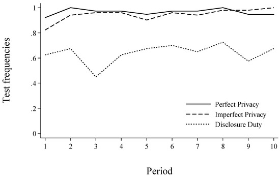 Testing frequencies in Perfect Privacy and Imperfect Privacy are higher than in Disclosure Duty. Testing frequencies in Perfect Privacy and Imperfect Privacy do not differ.