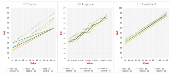 Figure 1 describes bidding as a function of valuation. From left to right, the first graph includes the six theoretical bidding functions (BF) derived in the numerical example of Section 2 (goods G1, G2, G3 under mechanisms F and S). Note that the equilibrium bidding functions are linear in valuation because the distribution is uniform. The second graph shows the empirical bidding functions. The x-axis represents valuations. To smooth out the empirical functions, we group valuations in bins of 5 units, starting at the minimum of 30 and ending at the maximum of 90 (so 30 to 35, 35.01 to 40, etc.). The y-axis shows the average bids that correspond to all the valuations included in that bin. The third graph depicts the regression-based experimental bidding functions. Since the theoretical bidding function is linear, we use the following OLS regression to estimate the best fit of the empirical bidding functions:
