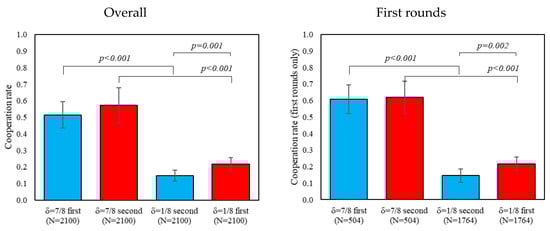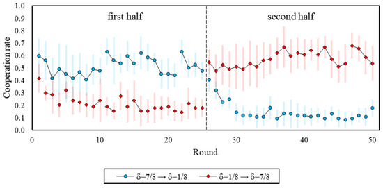 Alternatively, our findings could also be interpreted there, being no spillovers whatsoever, and merely that participants play randomly at first, and then slowly transition towards their preferred choices as they gain more experience with the games—still, we observe some order differences that challenge this interpretation. For example, we identify a positive trend in cooperation when δ = 7/8 is played after δ = 1/8, but not when δ = 7/8 is played before δ = 1/8, and also note that cooperation in δ = 7/8 is consistently higher than in δ = 1/8 at the outset.
