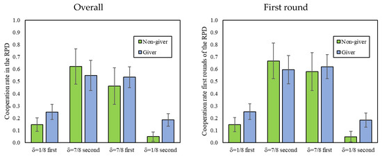 When comparing giving in the DGs played pre-RPD and post-RPD, we find that experiencing a combination of δ = 1/8 and δ = 7/8 reduces the degree of prosociality among participants, and that the order in which the environments are introduced does not affect such levels. This observation is potentially interesting in light of the evidence in Peysakhovich and Rand [