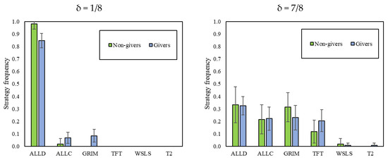 3], and provide additional insights. First, in both cases, defecting strategies describe the data better in the environments where cooperation is not an equilibrium. Second, in both cases, the cooperative strategy that is most often identified is “Tit-for-tat” (especially when δ = 7/8 is played after δ = 1/8). However, while “Grim” is not significantly present in [