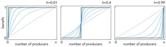 The parameter h defines the position of the inflection point: h→1 gives increasing returns and h→0 diminishing returns; s defines the steepness of the function at the inflection point (s→∞ models a threshold public goods game; s→0 models an NPD; the normalization in (9) in prevents the logistic function (10) from becoming constant for s→0) (Figure 1).