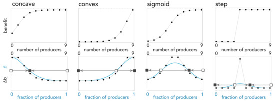 Figure 5 also shows an example of the difference between games with pairwise interactions and collective interactions. Two-player games are a special case of collective games with n = 2 and thus there are only one or zero sign changes; not surprisingly, therefore, there are only four possible types of sign change (always +; always −; from + to −; from − to +) and therefore four possible types of dynamics and four types of equilibria in games with two strategies with pairwise interactions (the same types we saw for concave and convex benefits).